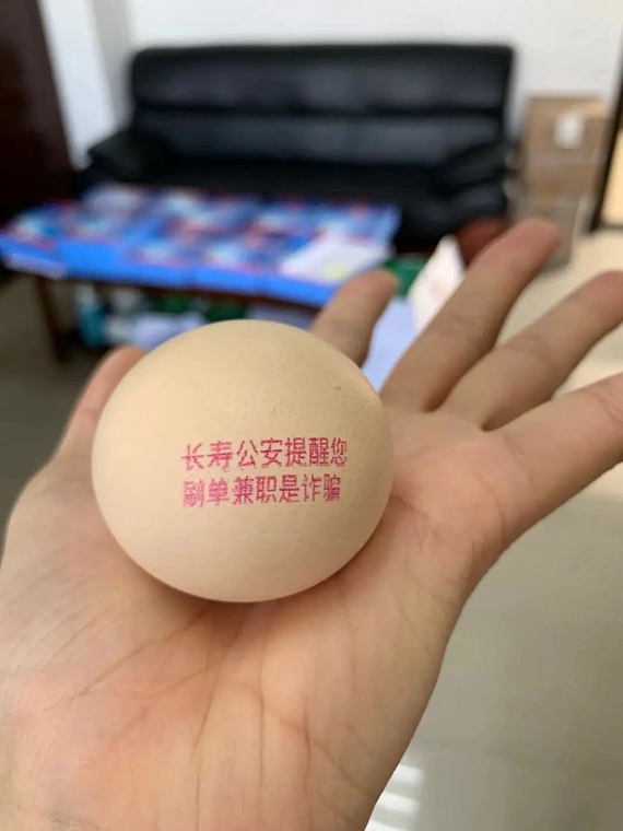 长寿区公安局警务保障处与本地蛋类生产商家联系,在小小的鸡蛋上印写了各种反诈骗宣传标语,通过超市、农贸市场的销售传递到广大市民手中,尤其是防范意识较弱的老年人。当鸡蛋成为宣传防电信诈骗的载体,迅速吸引了辖区居民的注意,纷纷表示“反诈蛋”很有意思,在购买鸡蛋时,还会刻意地挑选蛋壳上不同的反诈标语,轻松获得“反诈知识”。